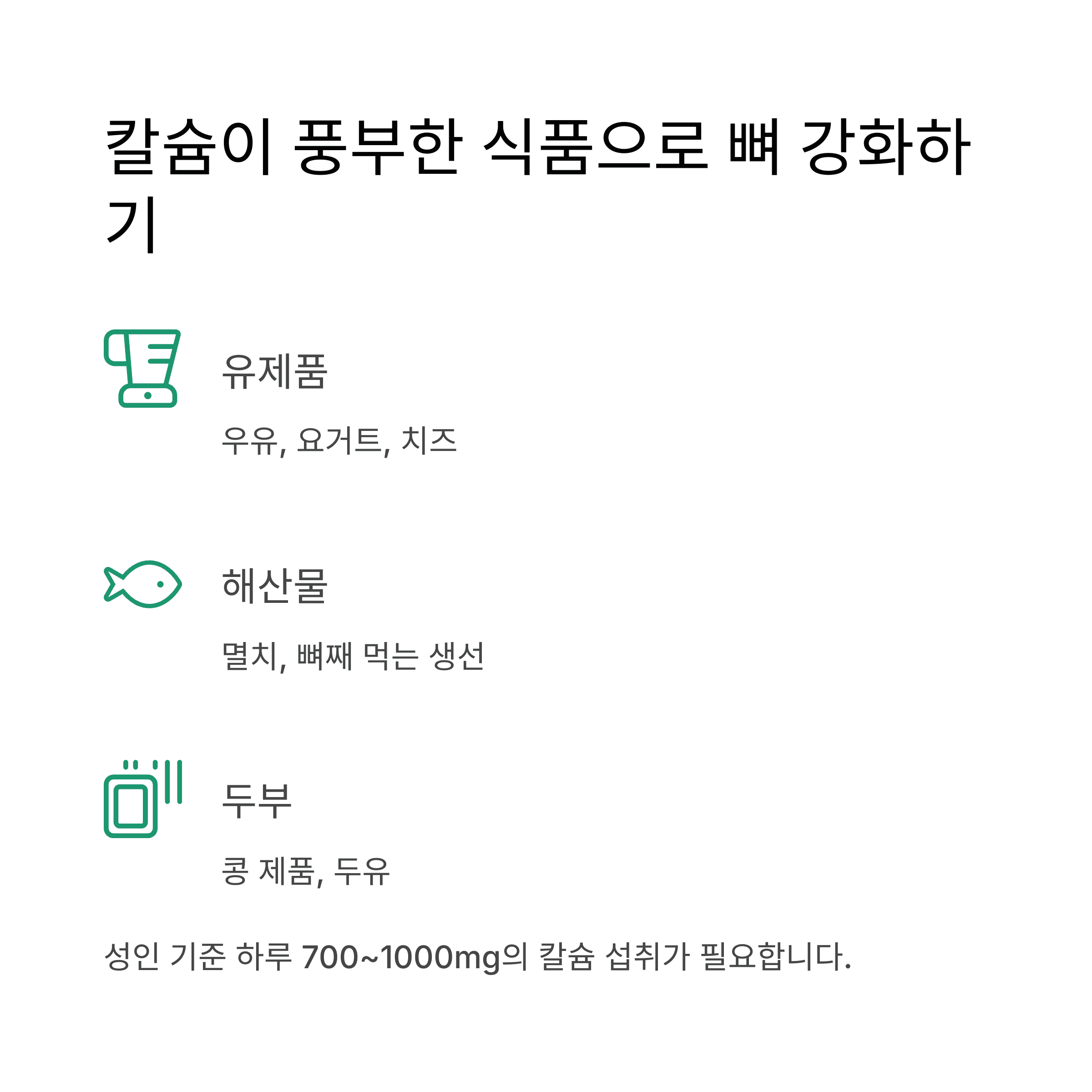 | 칼슘 | 뼈 강화 | 멸치, 두부, 유제품 |